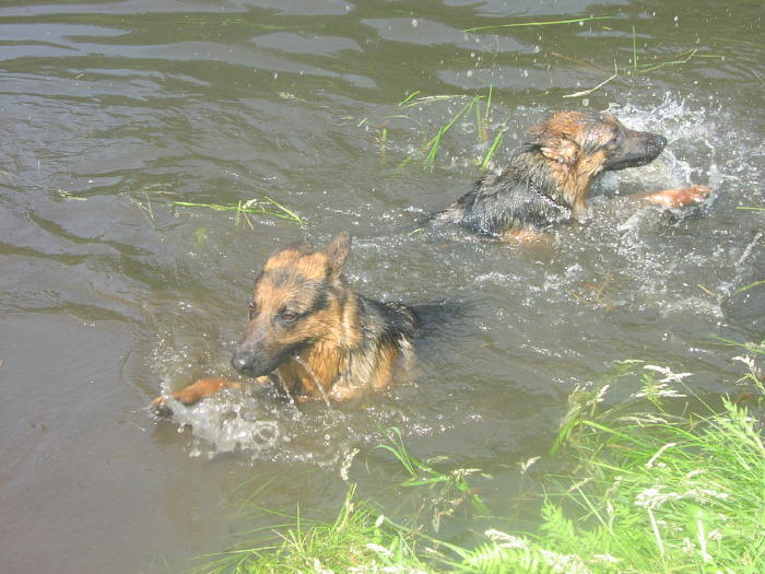 Abby and Pullin taking a swim in the pond |
