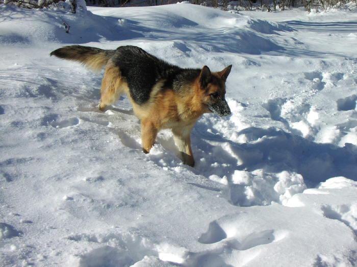 On right Brinka also loved to romp in the snow during the cold winter days |